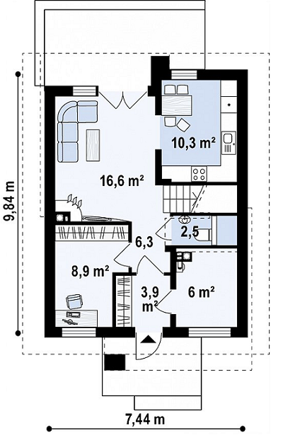 Размеры:9,84 x 7,44 м.