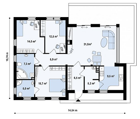 Размеры:10,74 x 14,64 м.