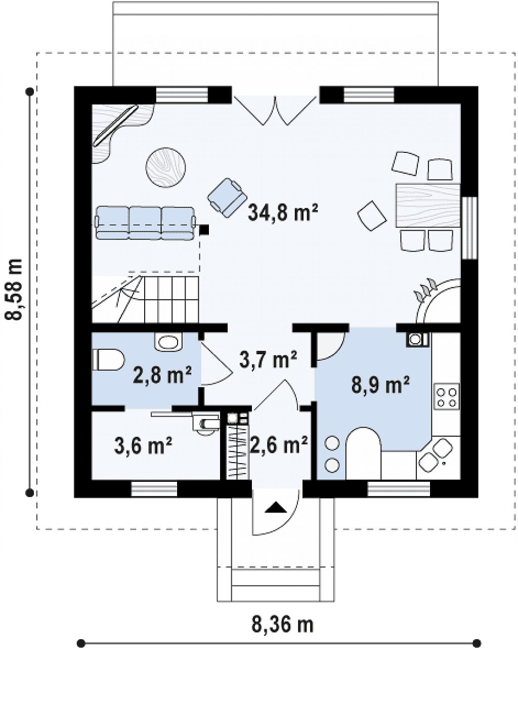 Размеры:8,58 x 8,36 м.