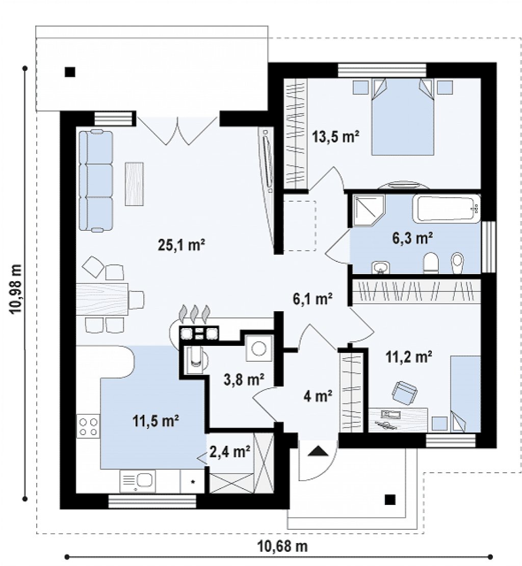 Размеры:10,68 x 10,98 м.